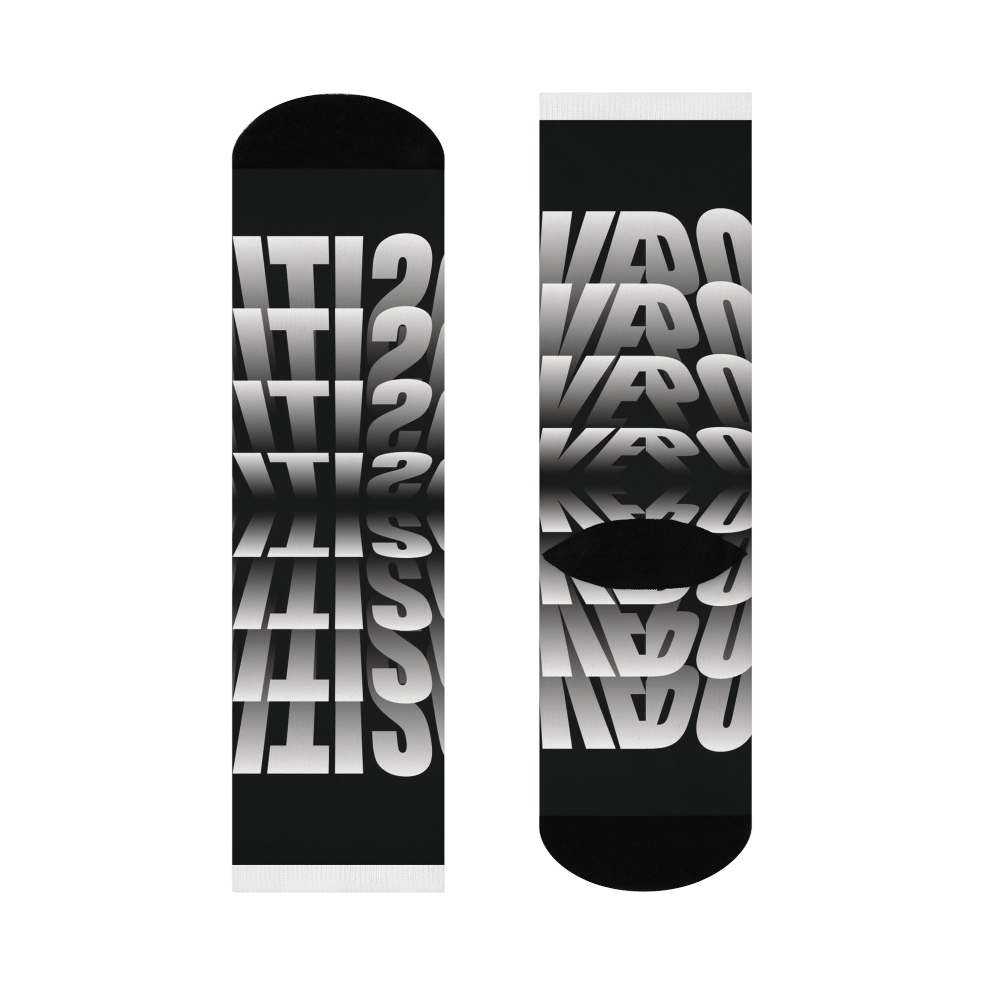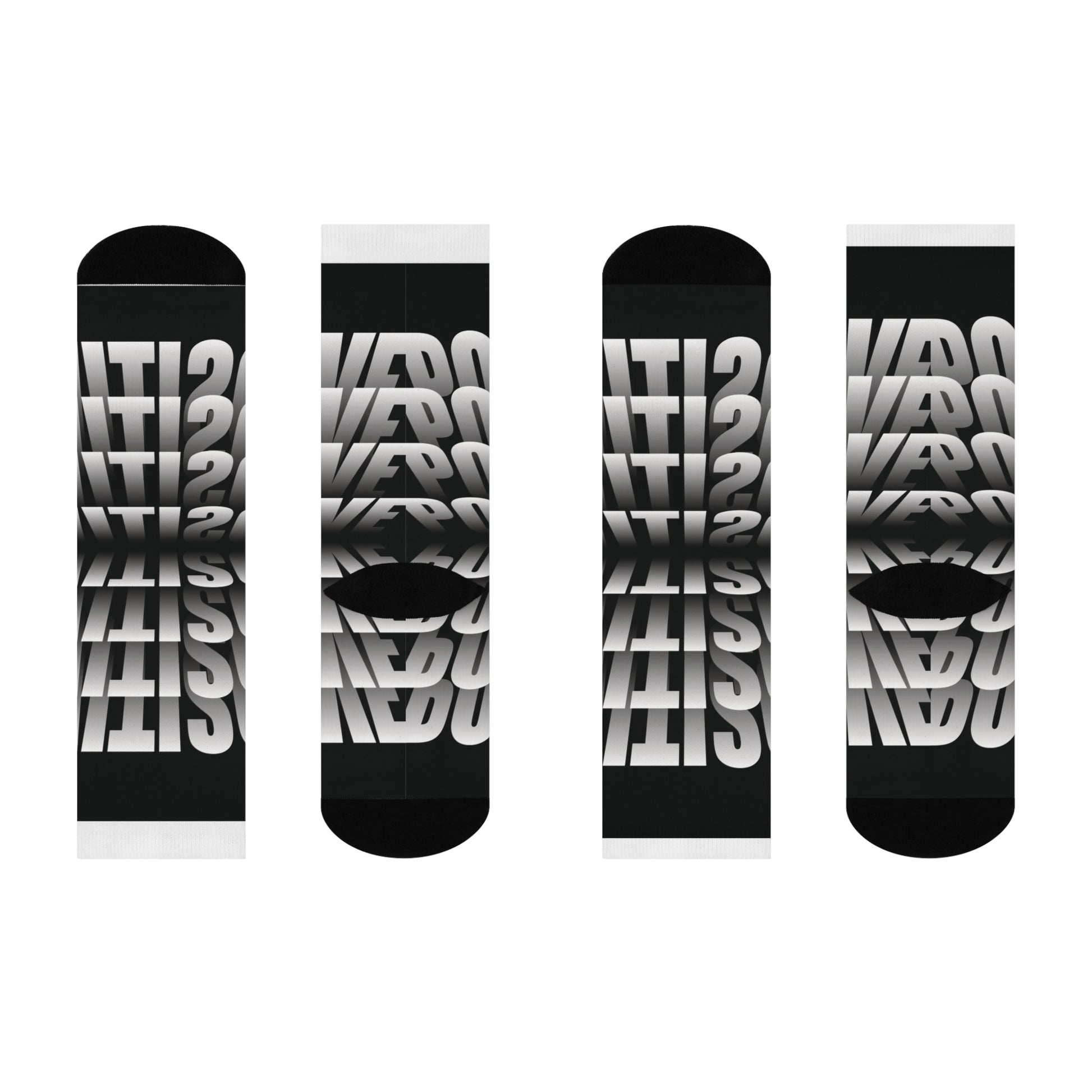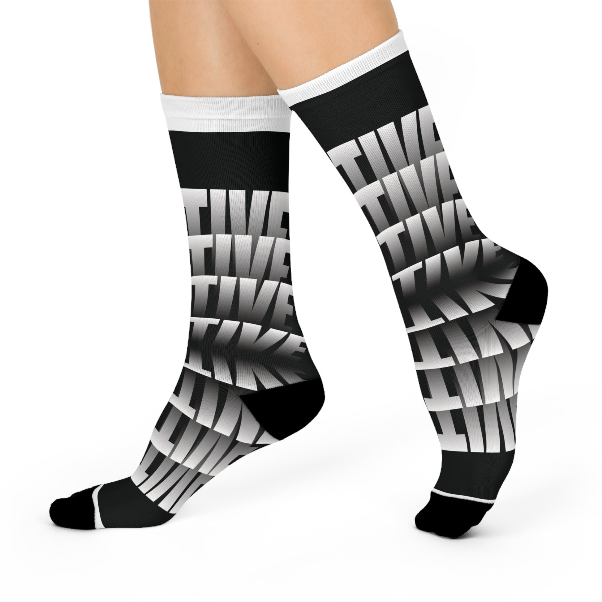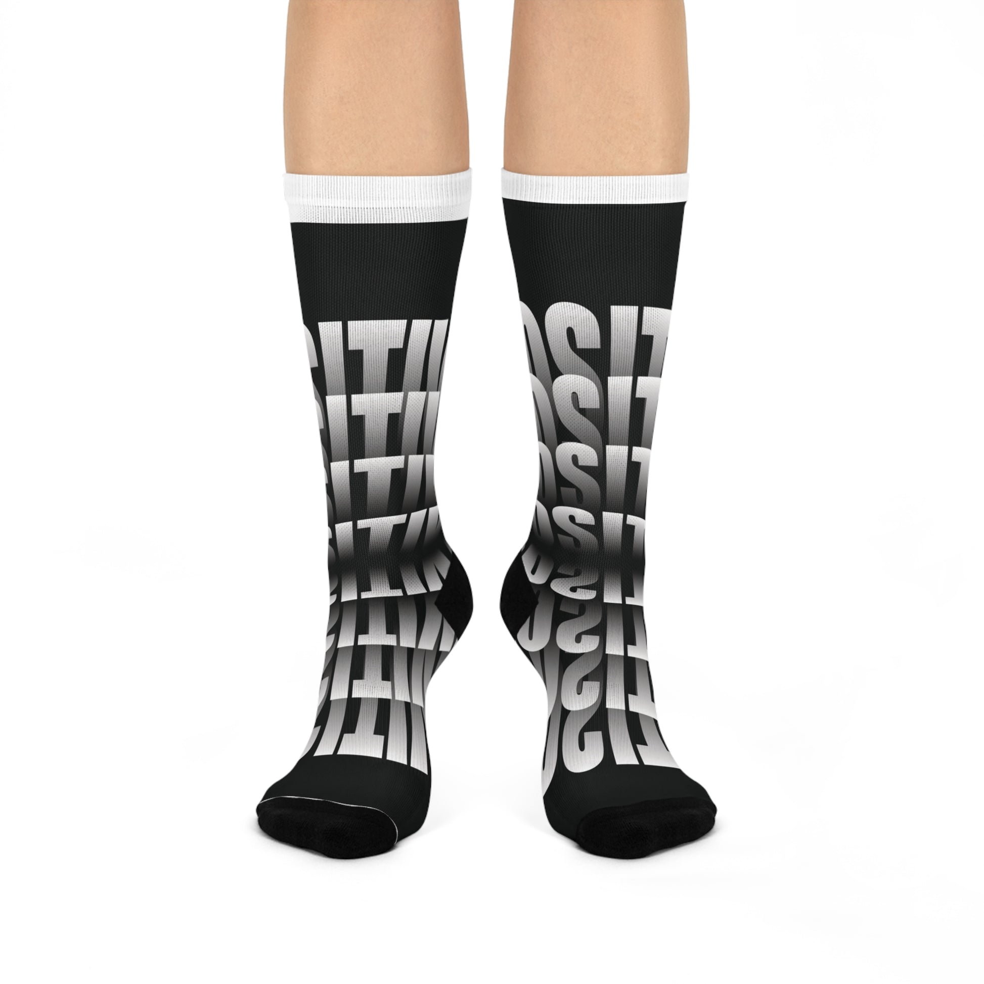 Walk with Positive Energy! These cushioned DTG crew socks are a one-size style designed with both function and appearance in mind. With the fully cushioned heel-to-toe, these socks provide superior comfort, while the DTG print process allows for ultra-crisp, crease-free printing. Composed of 73% polyester, 18% nylon, 6% spandex, and 3% cotton, these socks are an elevated alternative to the typical sublimation sock and provide a clean, comfortable base for your all-over print designs.